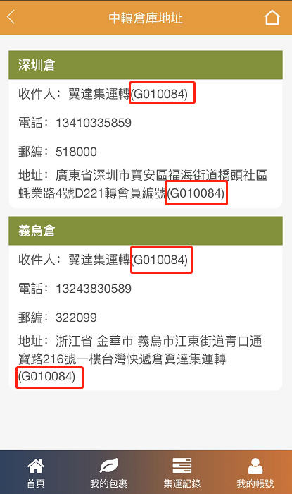 - 登入會員系統后,請查看您的专属會員號碼,以及各地區之收貨倉庫地址。網購時,請填寫我們中轉倉的地址、收貨人姓名及電話等資料,作為送貨地址。請注意,您必須在收件人、仓库地址后方將加入您的专属會員號碼,以示辨別。