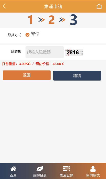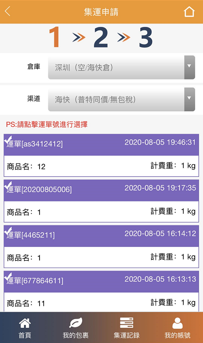 - 選擇倉庫、運輸渠道、及要寄回台灣的包裹↓