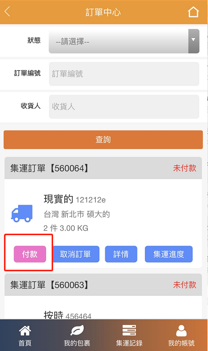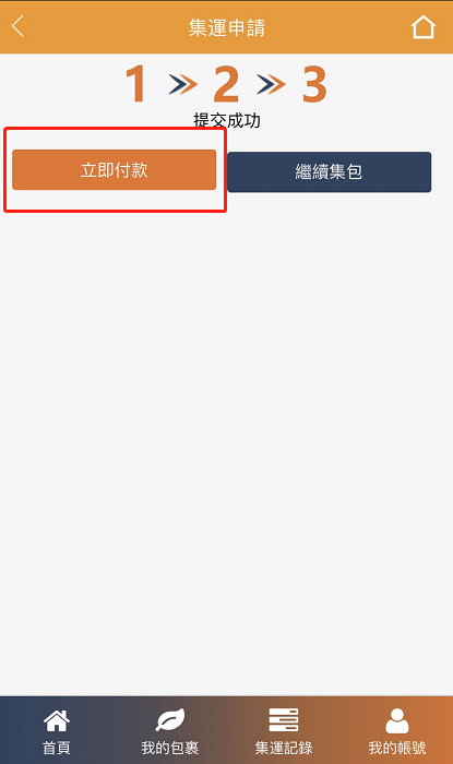 - 提交集包后可按系統提示付款。也可到集運訂單裡面完成付款